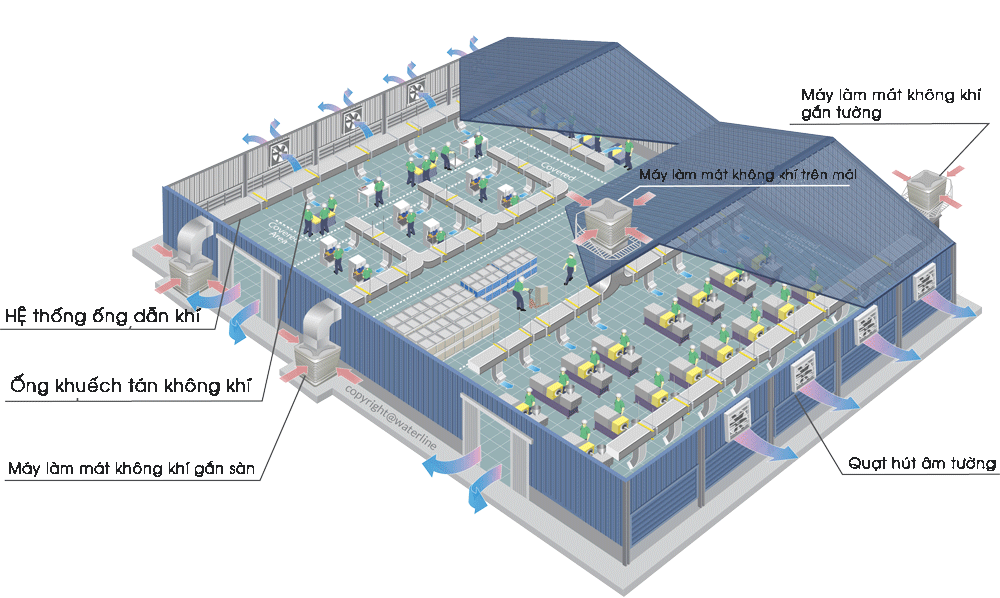 Với hệ thống làm mát này không chỉ có tác dụng thông gió, mà còn có tác dụng lọc sạch khí bụi bẩn độc hại trong nhà xưởng ra ngoài. Từ đó giúp bảo vệ sức khỏe công nhân khỏi các môi nguy hiểm từ bụi bẩn.