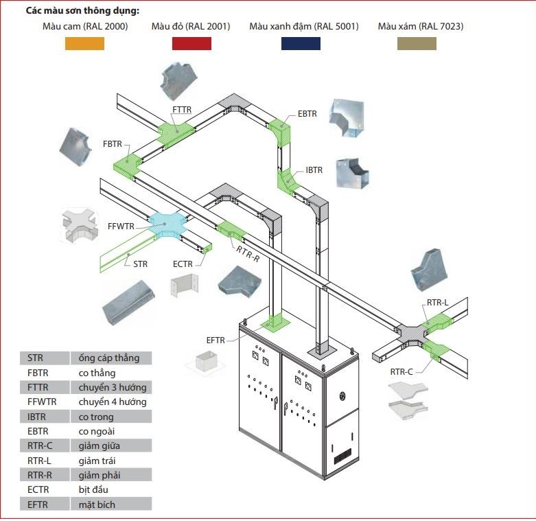 + Vật tư phụ kiện chi tiết của hệ thống thang máng cáp như: quang treo, cút tê-ren, cút Y,….